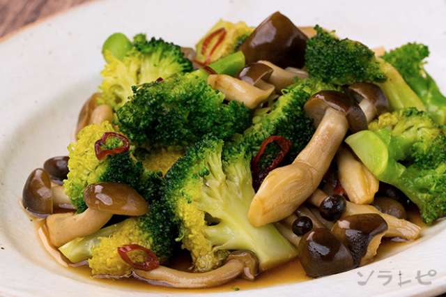 食欲そそるピリ辛ブロッコリーとしめじの酒蒸し風のレシピ 健康レシピと献立のソラレピ